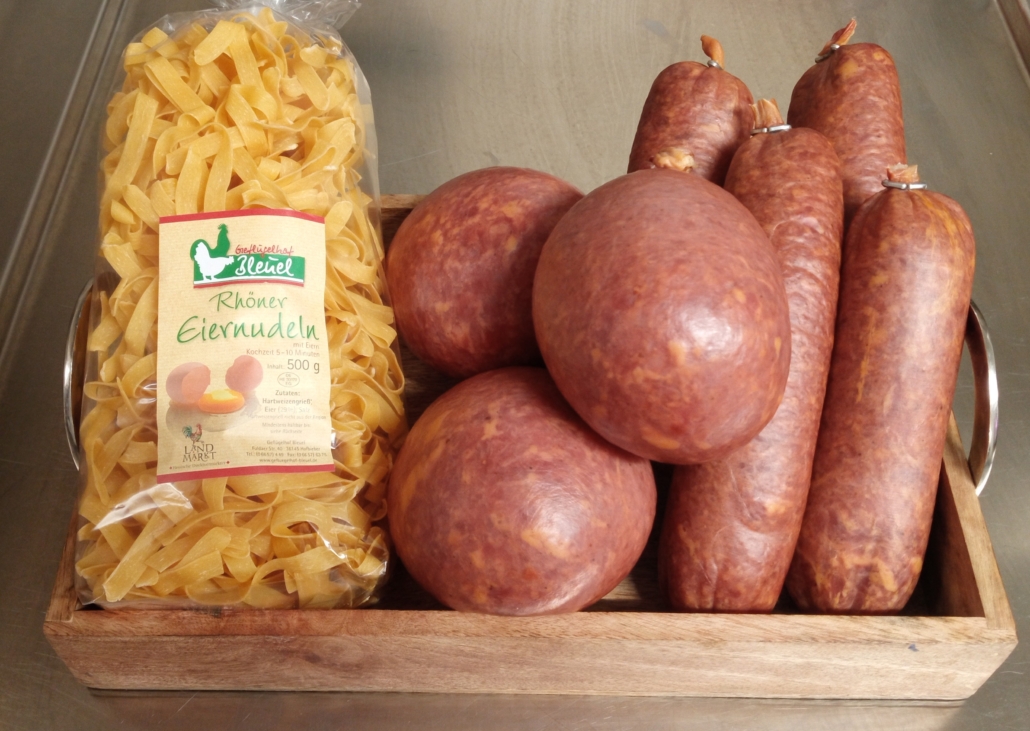 Bei uns erhalten Sie Flurgönder (den rohen, geräucherten Schwartenmagen) den man traditionell mit breiten Nudeln, in Butter gerösteten Semmelbröseln und grünem Salat isst.