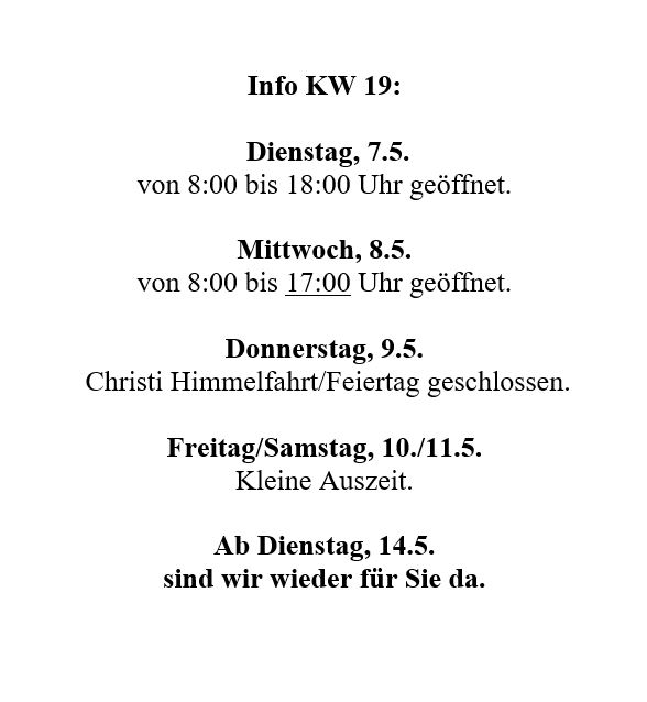 Ab Dienstag, den 16.01.2024 sind wir, wie gewohnt, wieder für Sie da.
